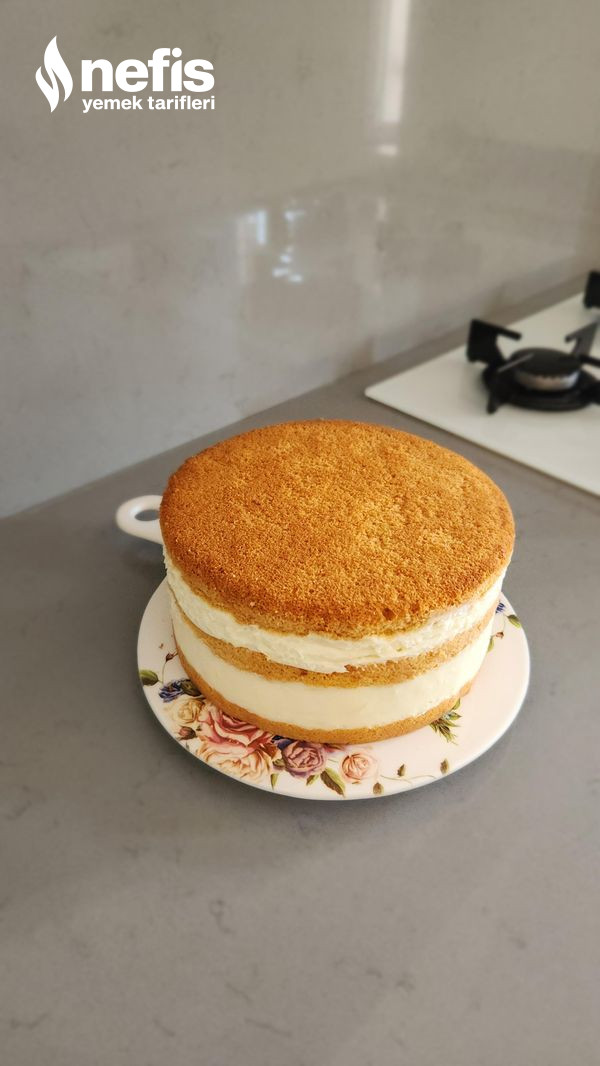 - 1 poşet kremşantiyi 1 çay bardağı soğuk süt ile çırpıp pastamızın birinci sıvasını yapalım.
