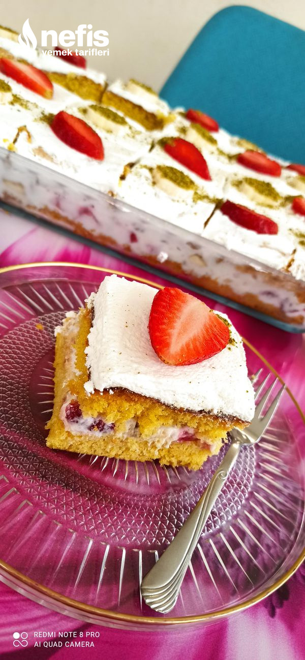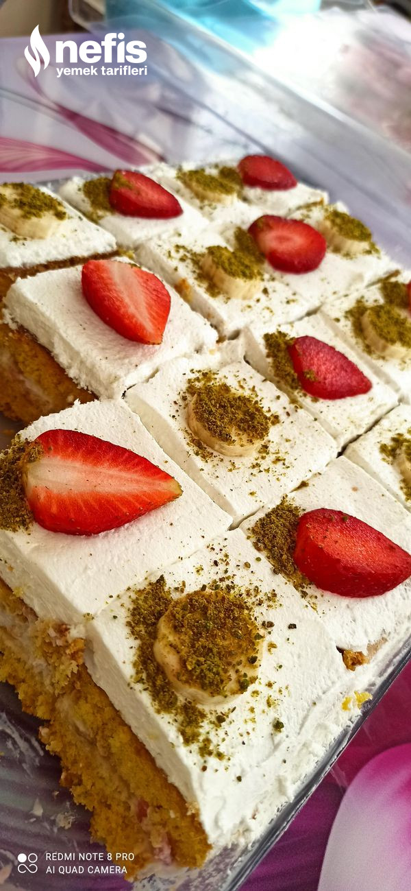 - Bu sırada krem şantiyi çırpalım ve kekimizin üzerine eşit formda dağıtalım. Pastayı dilimleyip üzerini muz, çilek ve toz antep fıstığı ile istediğimiz üzere süsleyip dolaba kaldıralım. 4-6 saat ortası dolapta bekletelim.