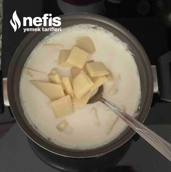 15. Ocakta kremayı kaynatıp içine beyaz çikolataları koyup, erimesini bekleyelim.