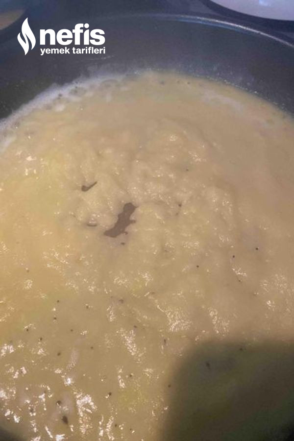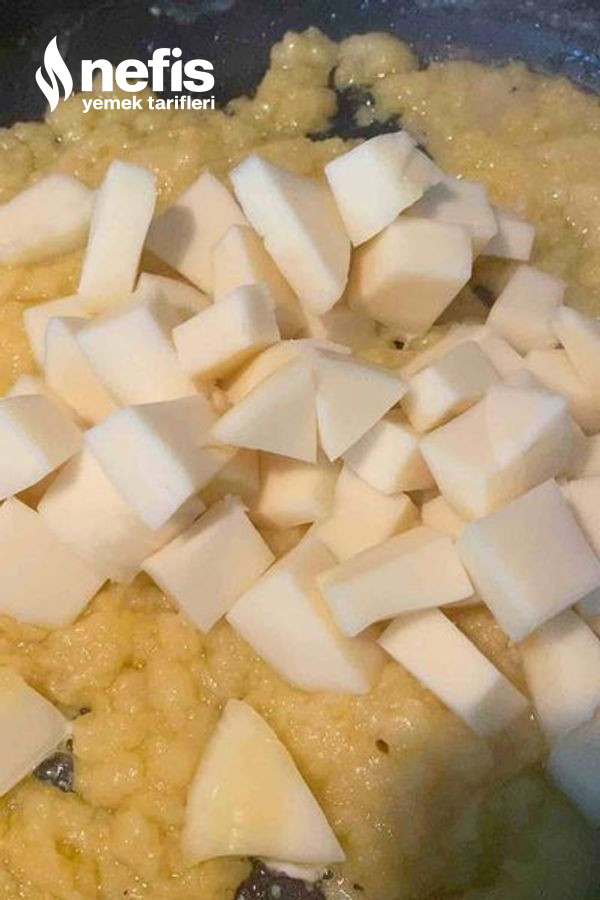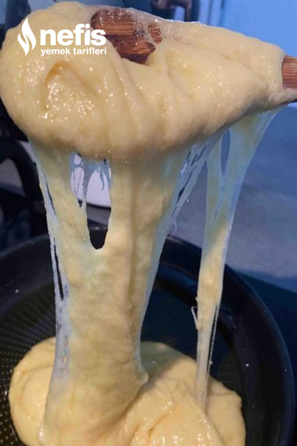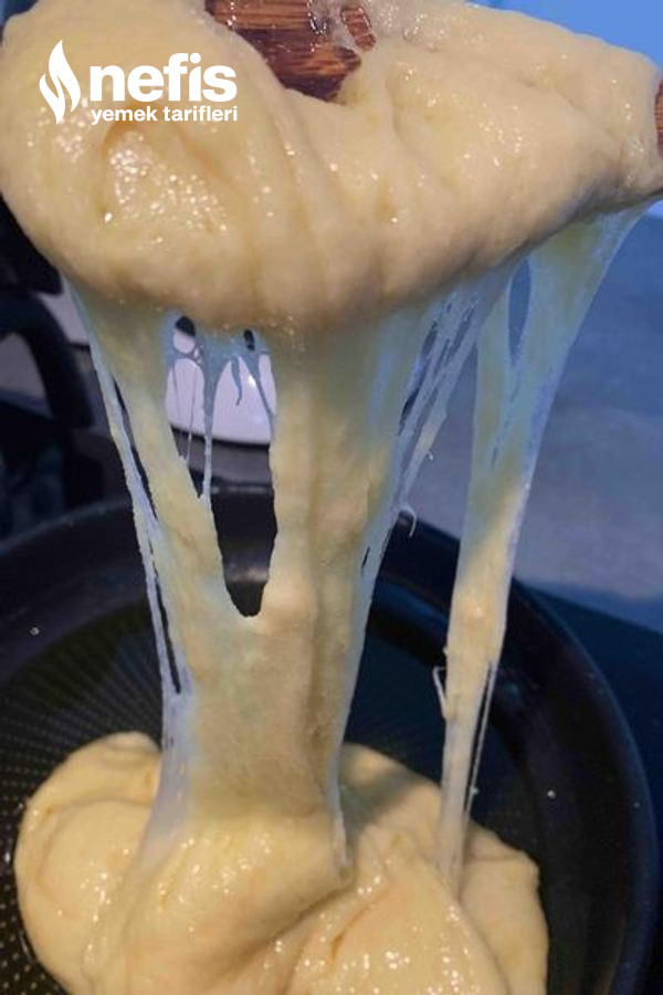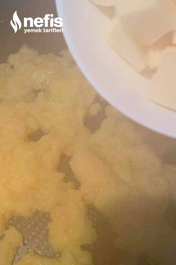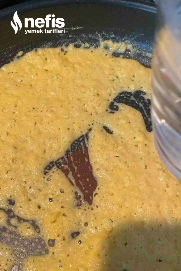 - Sonra 1 su bardağı suyu ekleyelim karışım katılaşıyor son olarak kaşarı ekleyelim ve karıştıralım.