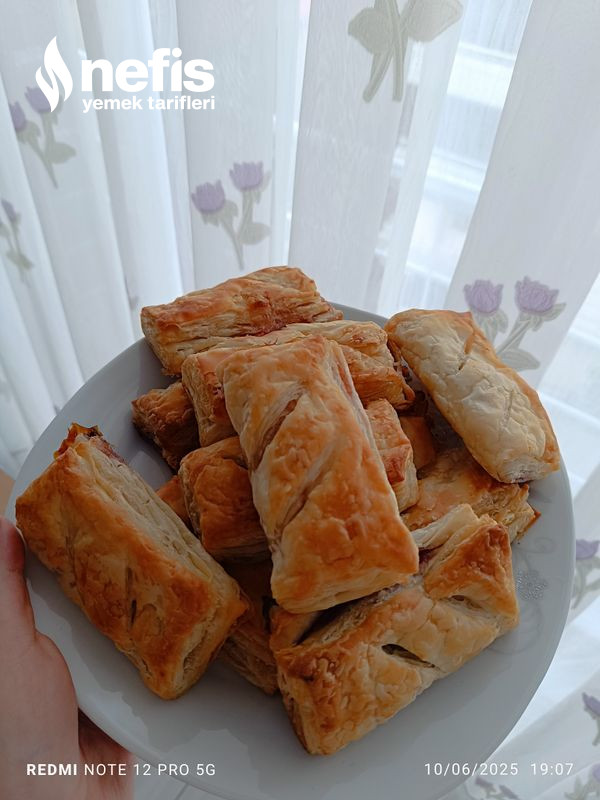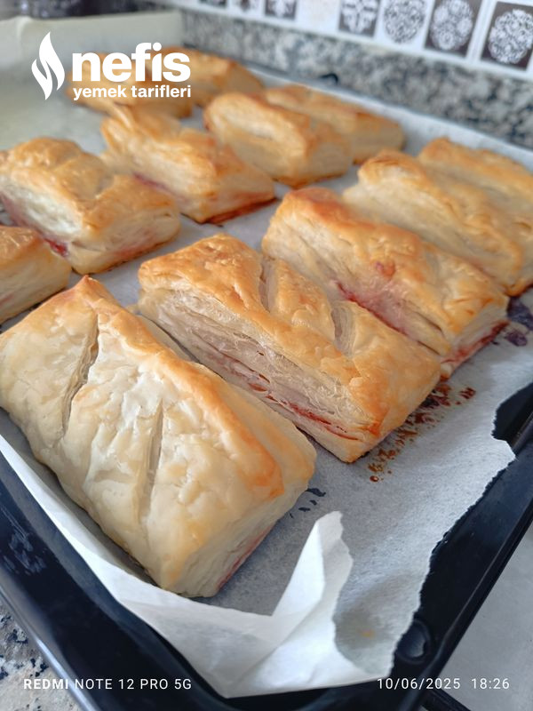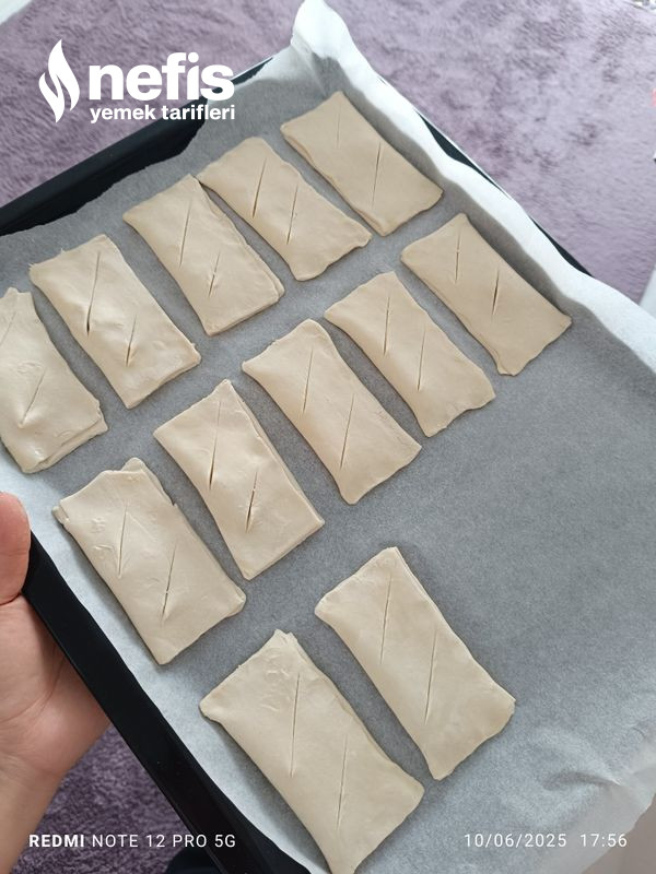 1. Milföyleri ikiye bölüp ortasına reçel, çikolata sürüp, ikiye yapıştıralım yeterlice kenarları dışarı akmasın.