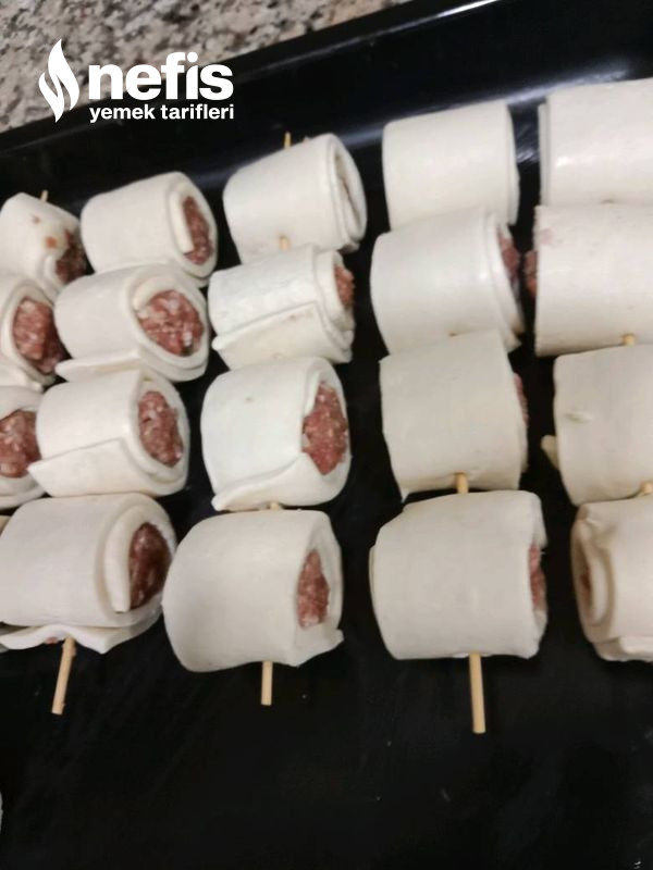 5. Çöp şiş takalım. Ortasını çok sıkıştırma boşluk kalsın. Hoş kızarsın tepsiye dizelim.