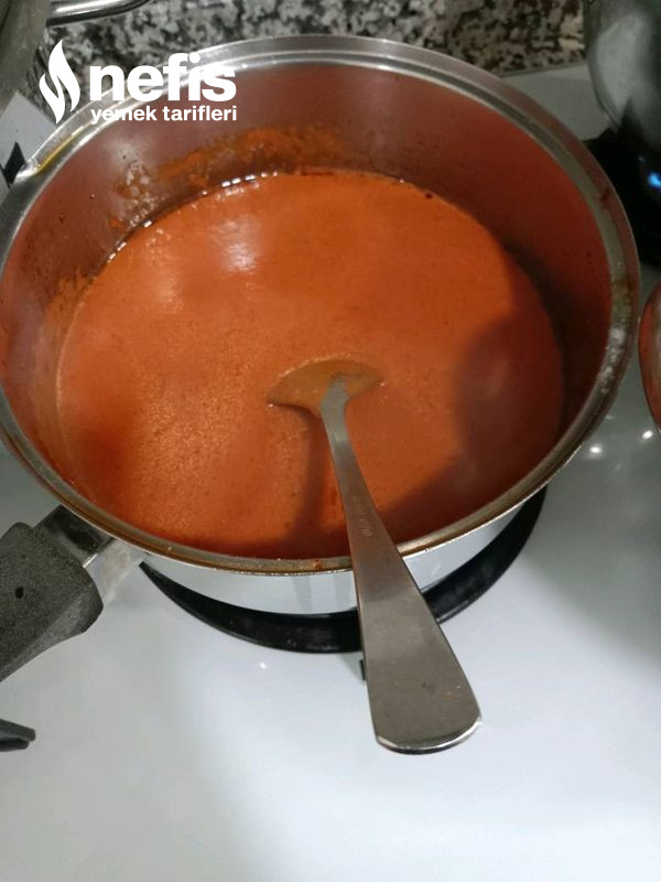 9. 1 su bardağı kadar su ekleyin salçayı az açın.