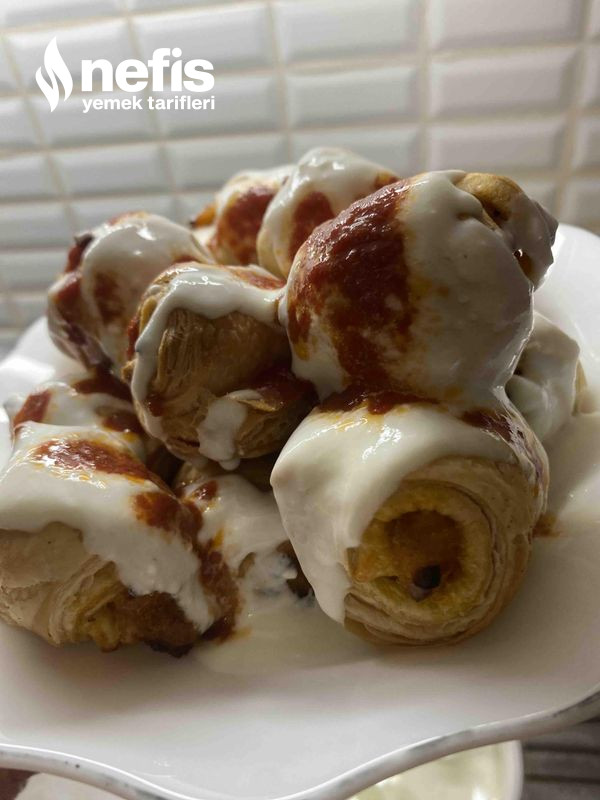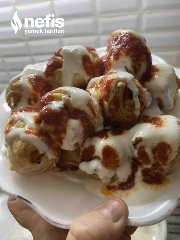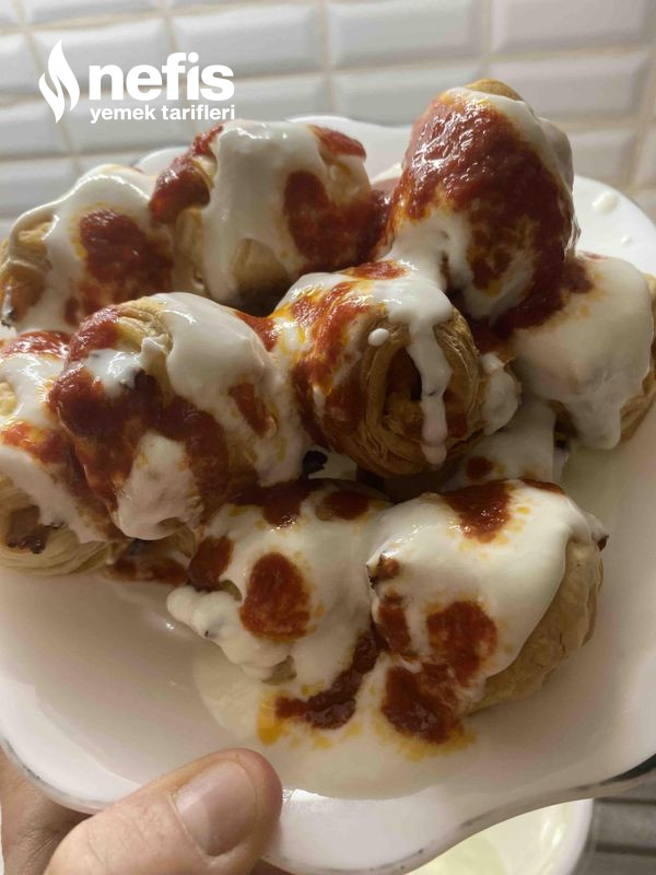7. Daha sonra pişen milföylerimizin üzerine yoğurt ve salçayı kendi isteğimize nazaran dökelim.Afiyet olsun🌸.