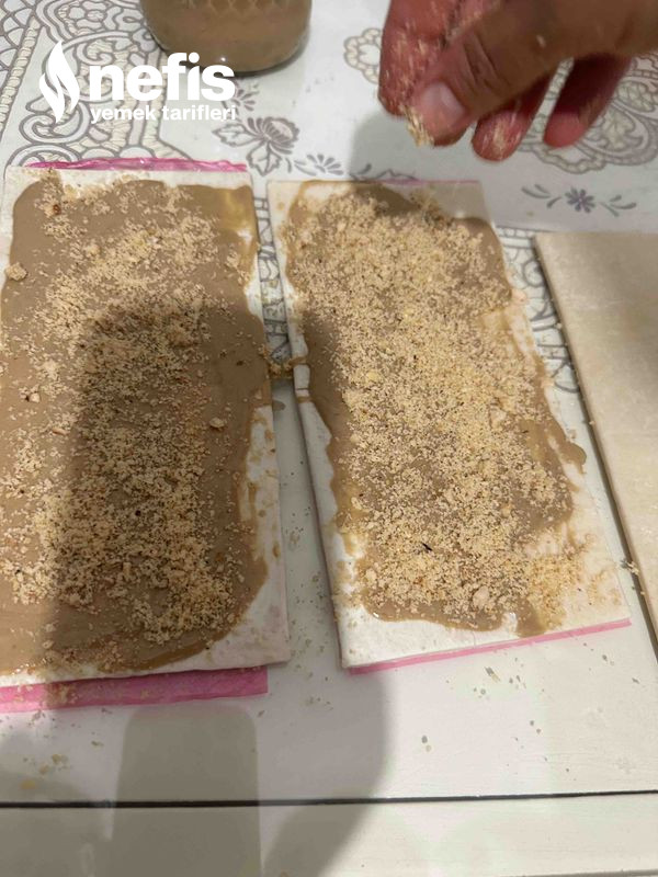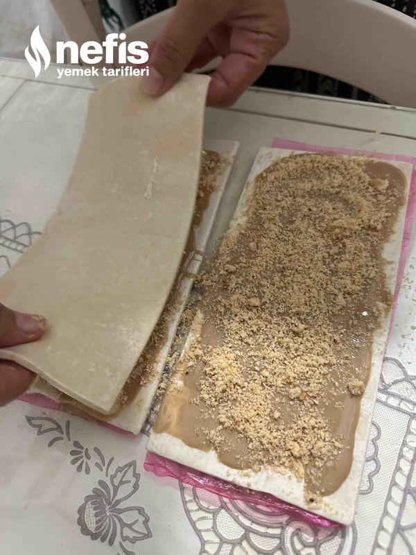 1. Bir milföyü alıyoruz, üzerine yemek kaşığı tahin döküp her yerini yayıyoruz. Yaydıktan sonra 2 yemek kaşığı fındık içini ve akabinde 2 yemek kaşığı şekeri serpiyoruz.