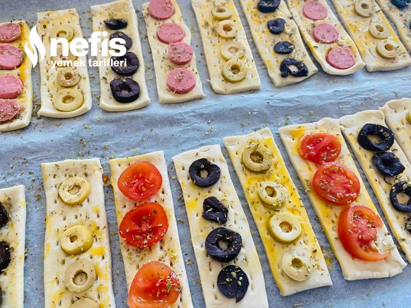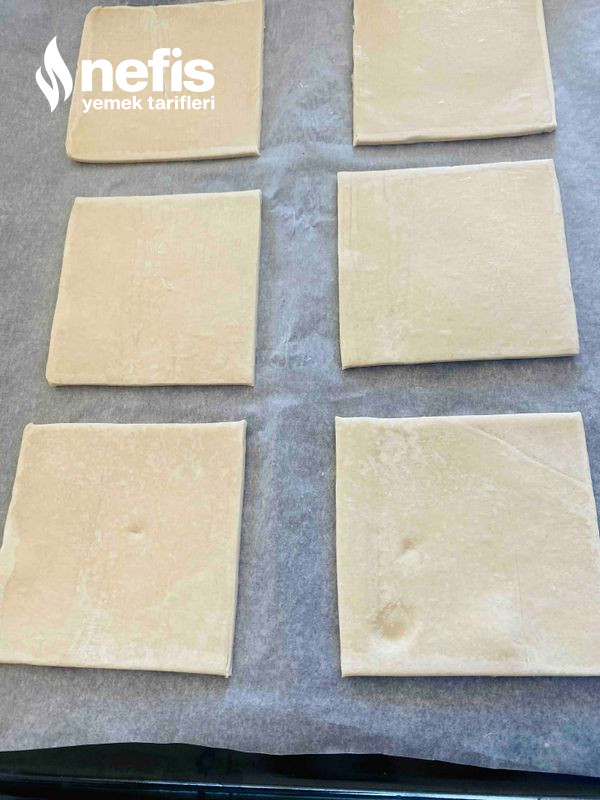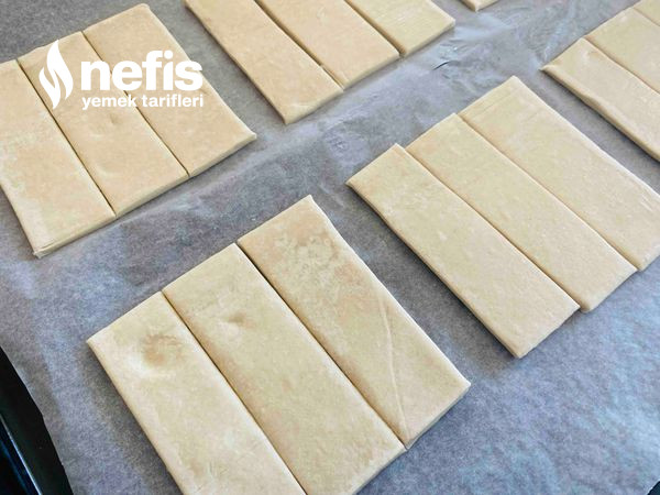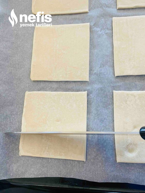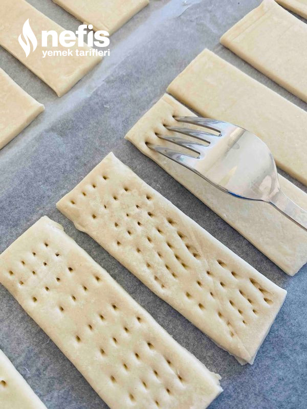 - Bir kare milföyü 3 eşit kesime bölelim üzerine çok kabarmaması için çatal ile delikler açalım.