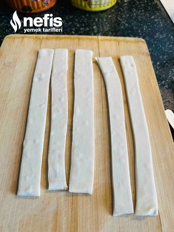 3. Elimizi ıslatırsak daha hoş sarabiliriz ,köftemizi güzelce sardıktan sonra oda sıcaklığında ki milföyü 1 cm biçiminde şerit biçiminde keselim.