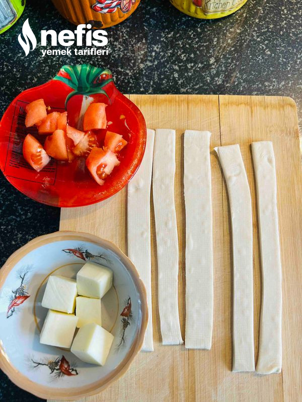 2. Kaşar peyniri küp küp keselim dolaba koyduğumuz köfteyi çıkarıp orta uzunluk büyüklüğünde alıp elimizle açalım ,içine bir kaşar bir domates diliminden bırakıp saralım.