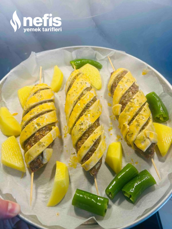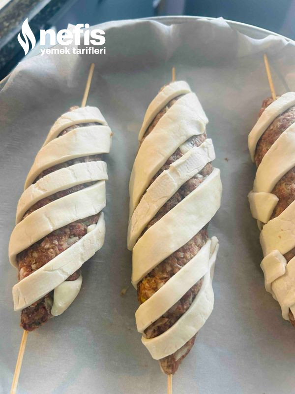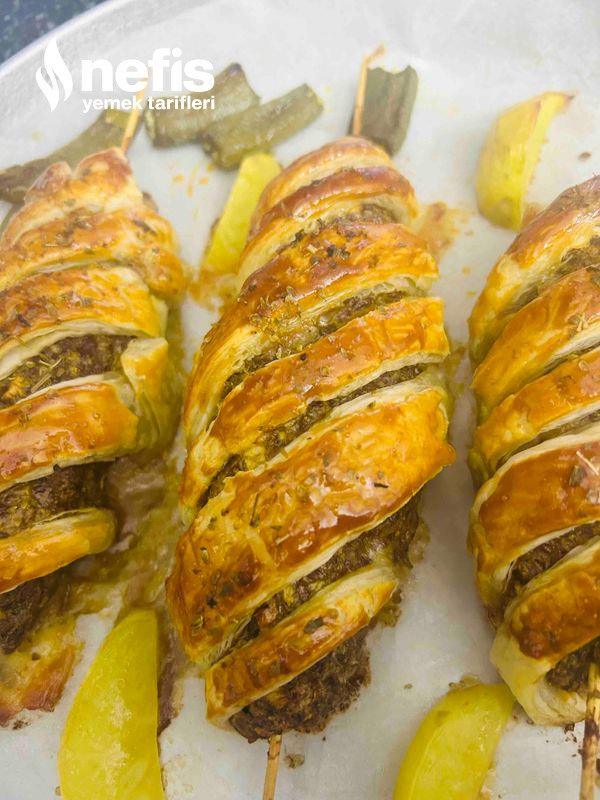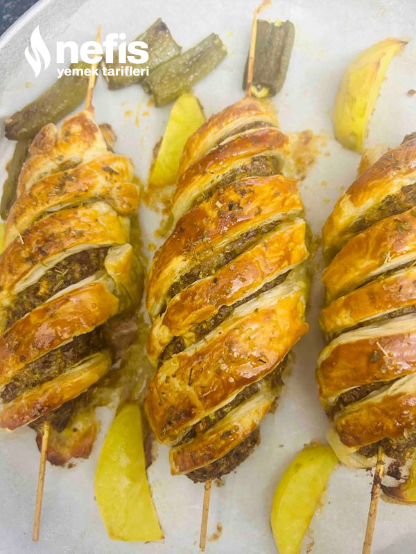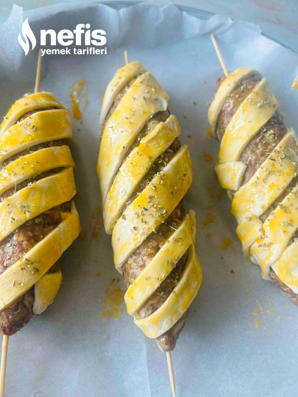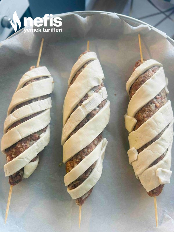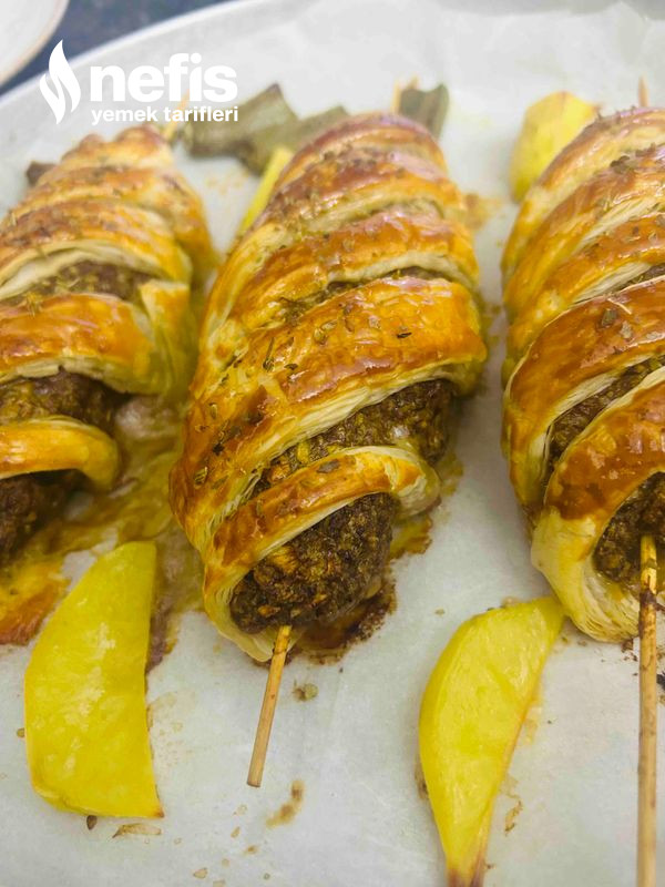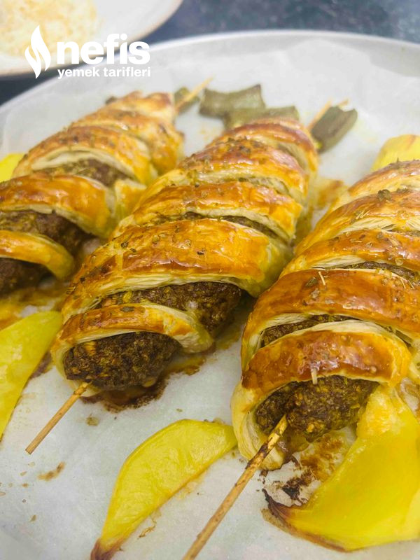 4. Çöp şişin başlangıç noktasından başlayarak köftenin üzerini saralım, milföylerin üzerine yumurta sarısı sürüp 180 derece fıırnda pişirelim.