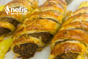 4. Çöp şişin başlangıç noktasından başlayarak köftenin üzerini saralım, milföylerin üzerine yumurta sarısı sürüp 180 derece fıırnda pişirelim.