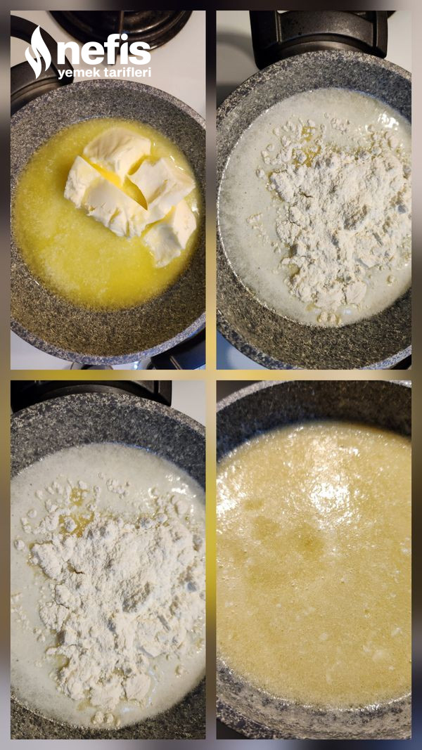 - Tavada tereyağı eritilir ve un ek edilerek yeterlice karıştırılır. Un renginin kararmaması gerekir.