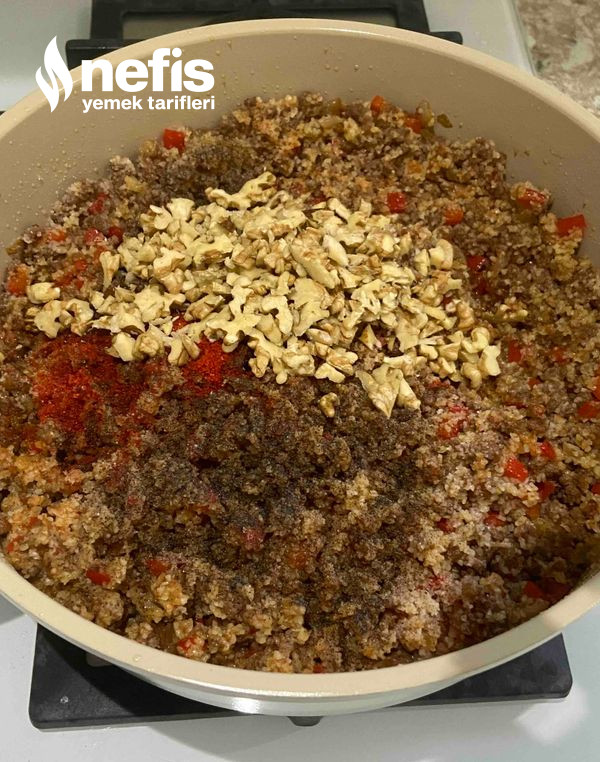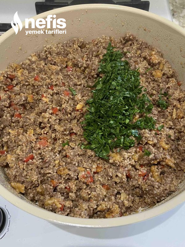 - Islanan bulgurları ek ediyoruz, cevizi ve baharatlatı ek ediyoruz, maydanozu ek edip güzelce karıştırıyoruz,.