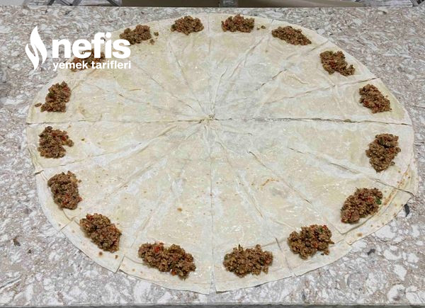 - Yufkayı tezgaha serip üzerine yağlı su karışımından sürüyoruz ve ikinci yufkayı üzerine seriyoruz, 16 eşit üçgen kesime kesip harcdan koyup sarıyoruz, bütün yufkalar bitene kadar birebir süreci yapıyoruz.