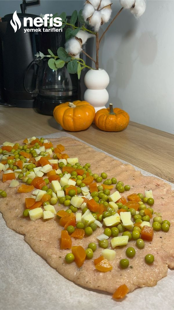- Dinlenen tavuk harcımızı yağlı kağıt üzerinde açıp üzerine garnitür serip rulo biçiminde sarıp yarım saat dondurucuda bekletiyoruz.