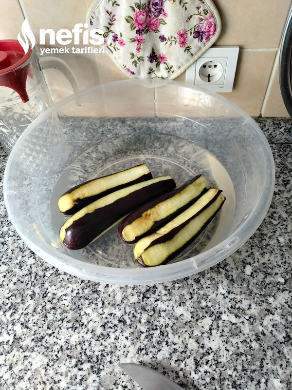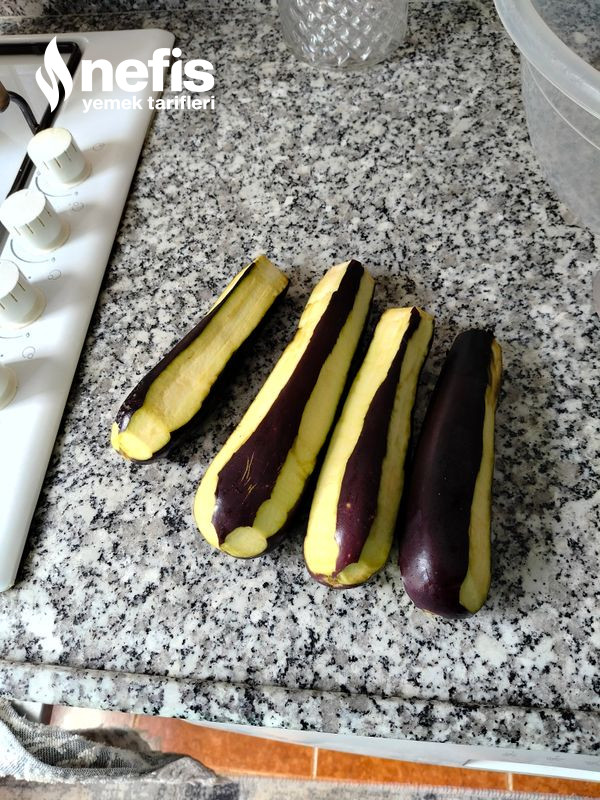 1. Patlıcanları çizgili formda soyup yarım saat tuzlu suda bekletiyoruz.