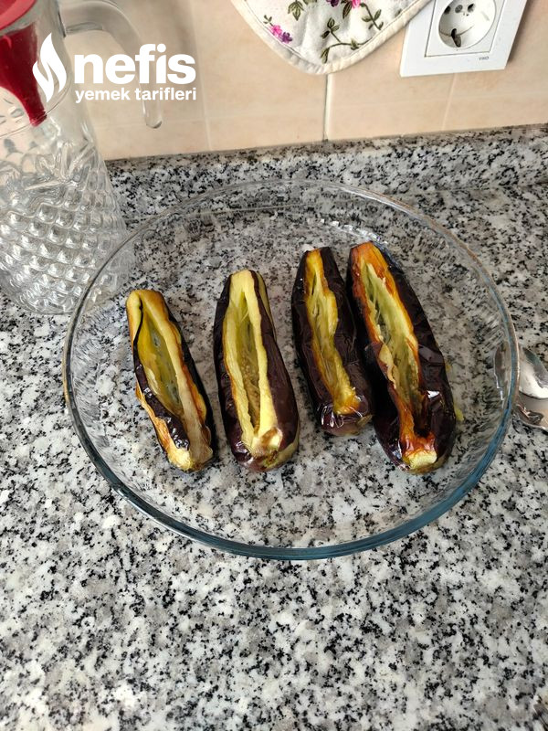 2. Daha sonra patlıcanları sudan alıp kağıt havluyla suyunu çektiriyoruz. Yağda kızartıp ortasını bir bıçak yardımıyla açıyoruz.