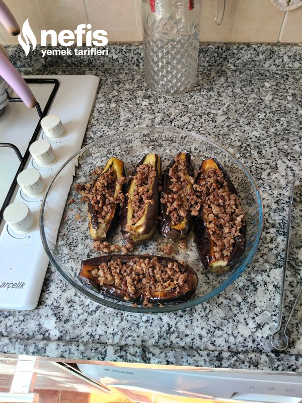 5. Hazırladığımız iç harcımızı patlıcanların ortasına dolduruyoruz ve üstünü domates ve biberle kapatıyoruz.
