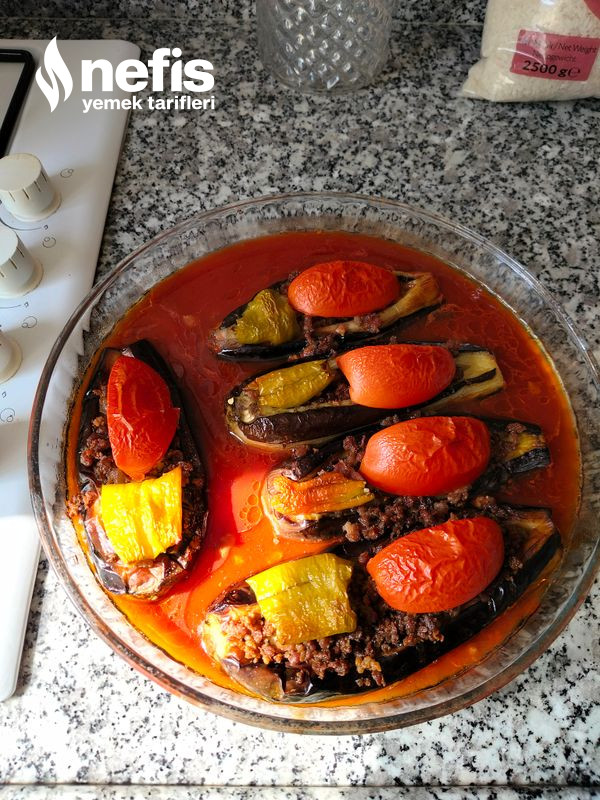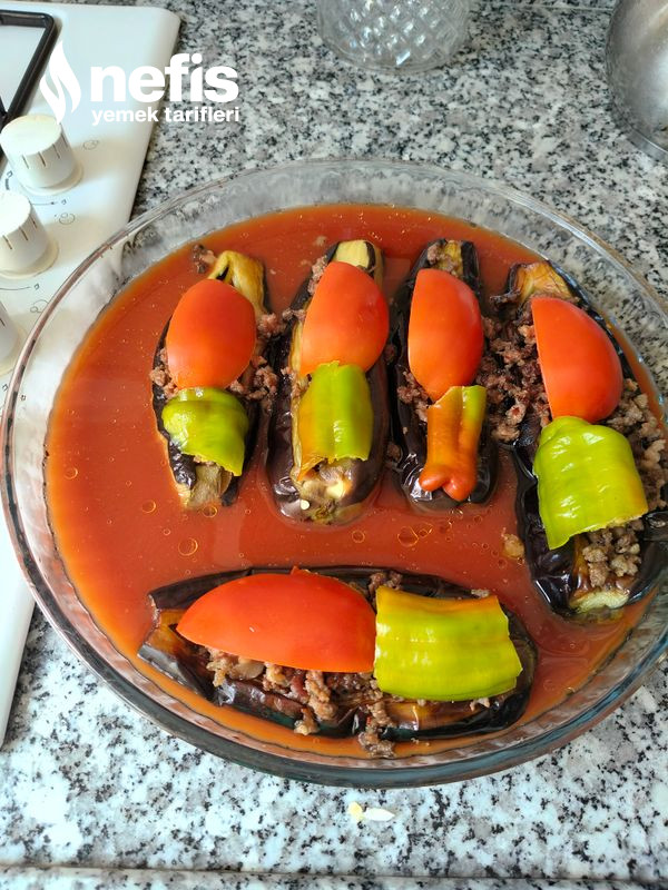 6. Ayrı bir kapta salçamızı sıcak su yardımıyla eritip patlıcanların kenarlarına döküyoruz ve akabinde evvelce ısıttığımız 170 derecelik fırında yarım saat pişiriyoruz. Afiyet olsun.