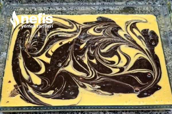 5. Kakaolu hamuru da sade kek hamuru üzerine döküp mozaik biçim verelim.