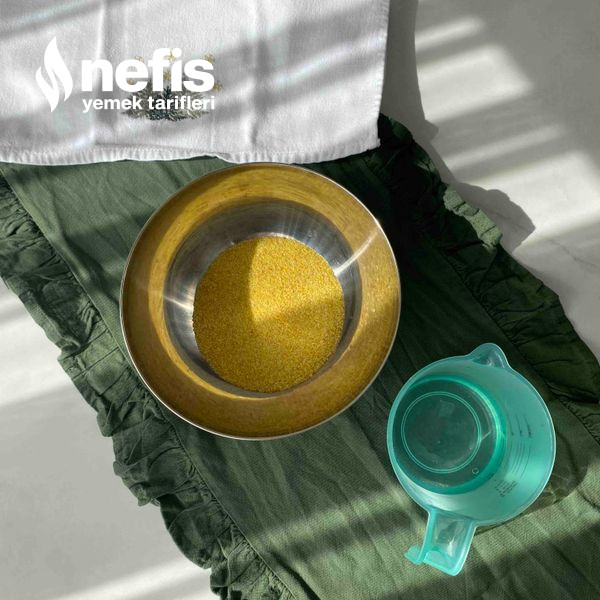 - Bir kaba bulgurumuzu alıyoruz üzerine sıcak suyumuzu ekliyoruz.