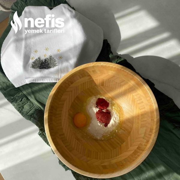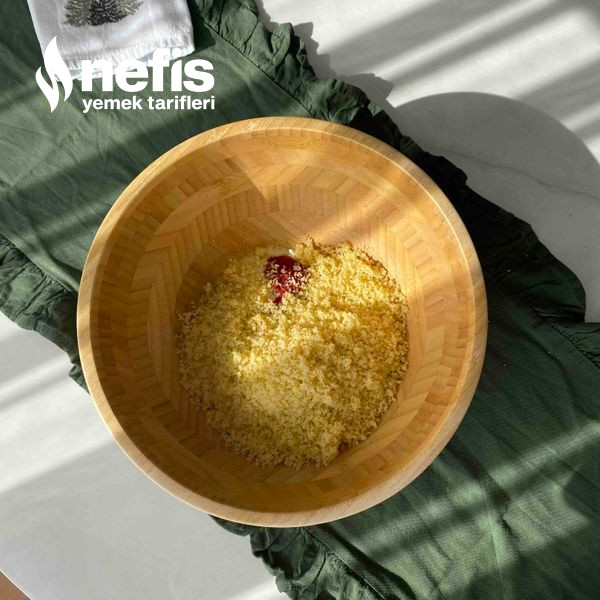 - Ayrı derin bir yoğurma kabına irmik,yumurta,salça,un ve tuz koyuyoruz.