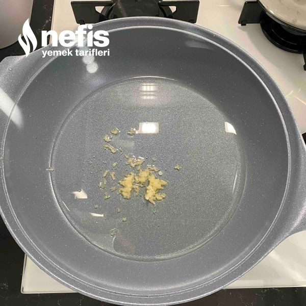 - Sosumuzu hazırlıyoruz. Tavamıza yağımızı ve rendelediğimiz sarımsaklarımızı koyuyoruz ve kokusu çıkana kadar kavuruyoruz.