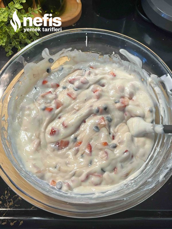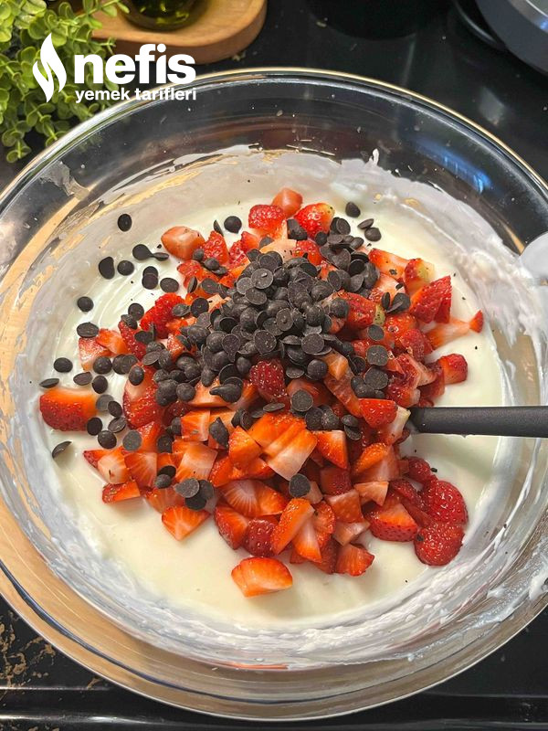 - Üzerine doğranmış çilek ve damla çikolata ekleyip karıştıralım.