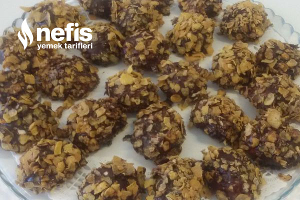 - Soğuyan kurabiyelerimizi evvel benmari tarzı erttiğimiz çikolataya sonra mısır gevreğine bulayalım tepsiye dizelim.