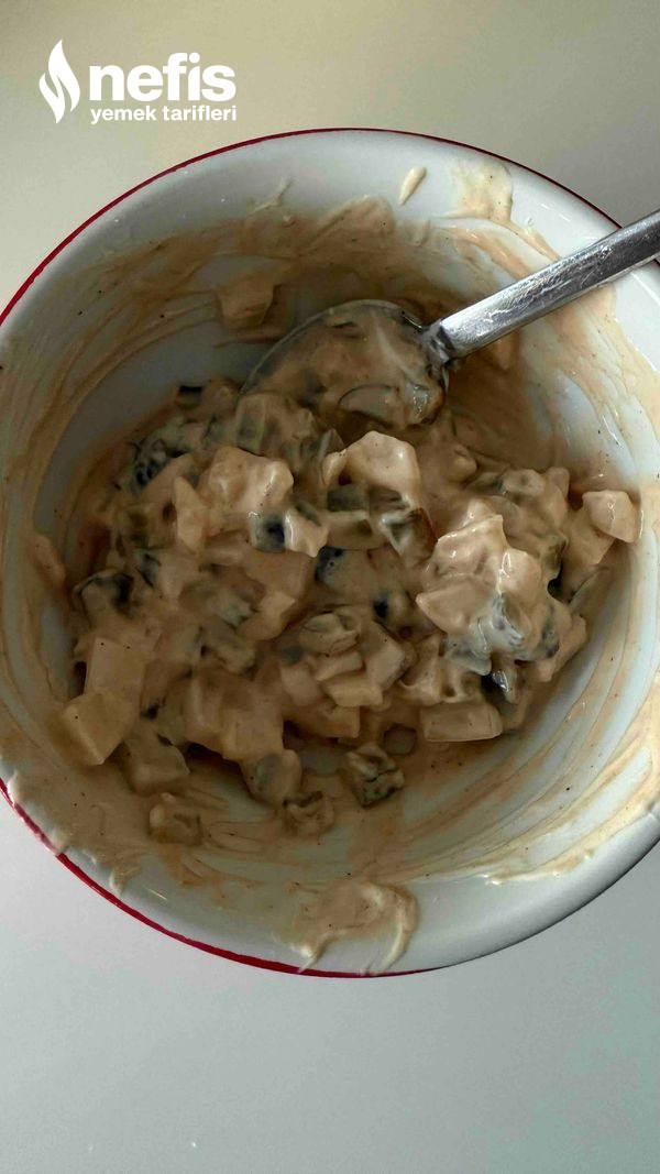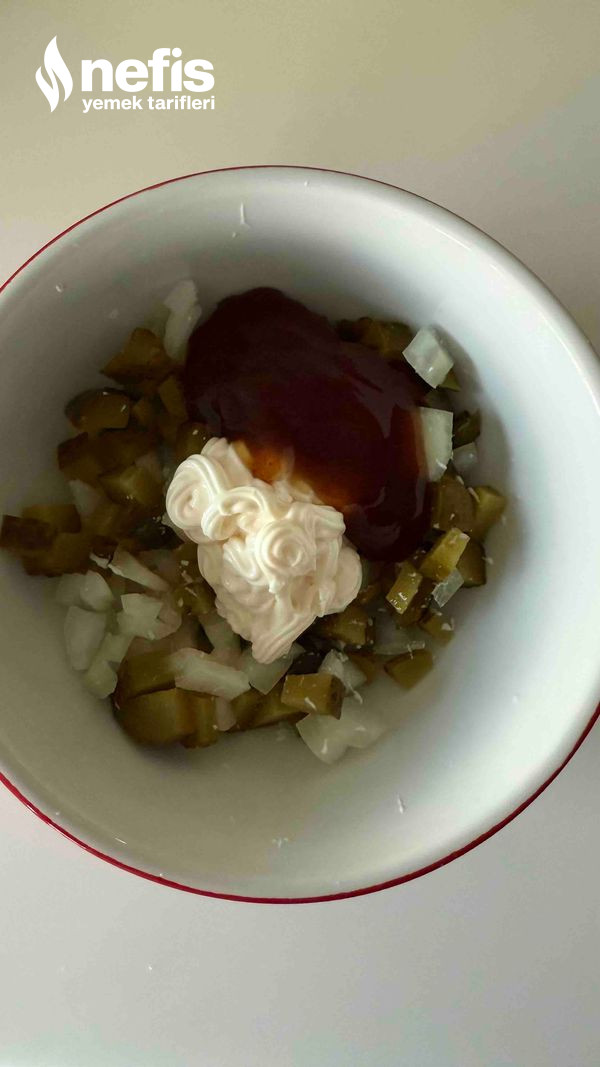 - Soğanı küçük doğrayıp kaseye alın, turşu küçük küçük kesip ekleyin, mayonez ve barbekü sosu ekleyin karıştırın.