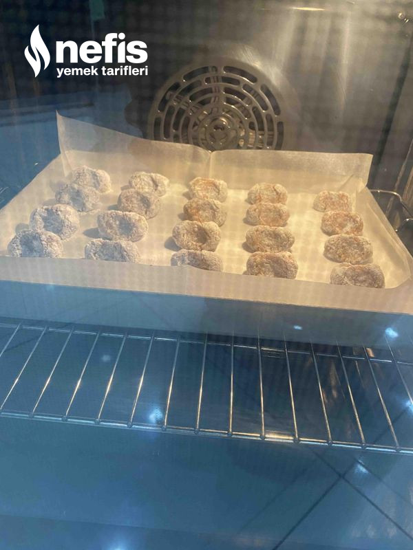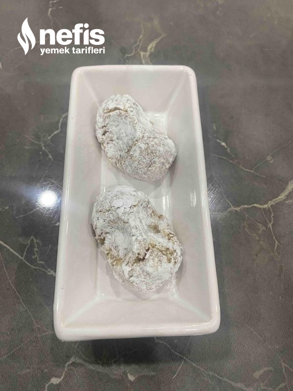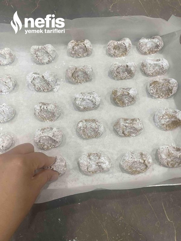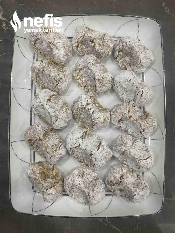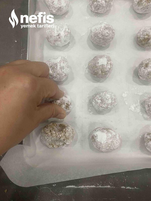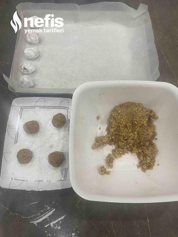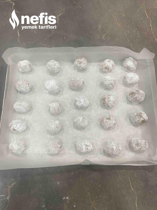 - Ceviz büyüklüğünde toplar yapıp pudra şekerine bulayıp tepsiye diziyoruz.
