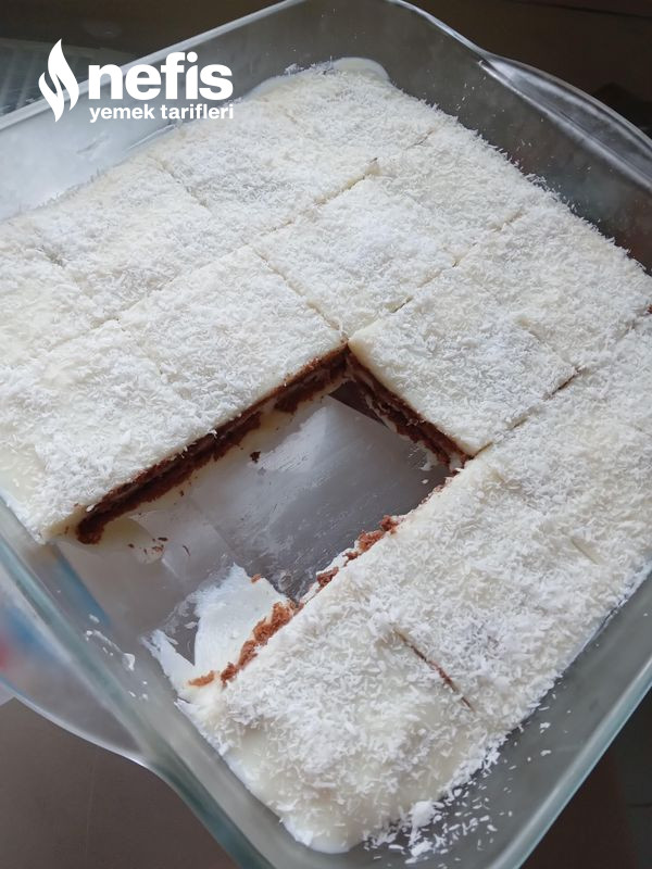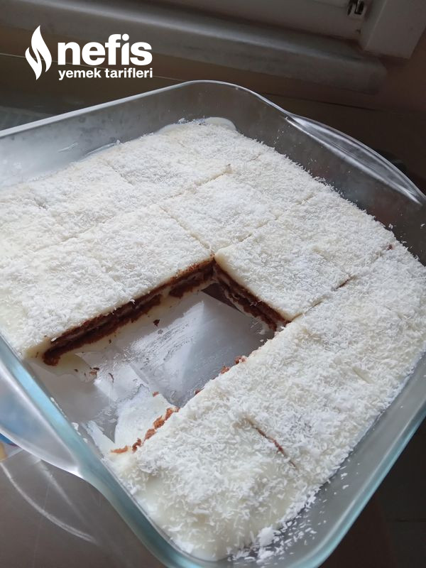 - En son bir kat daha muhallebi koyarak pastamızı bitirelim. Soğuyunca üzerine hindistan cevizi dökelim. Afiyet olsun.
