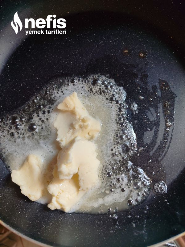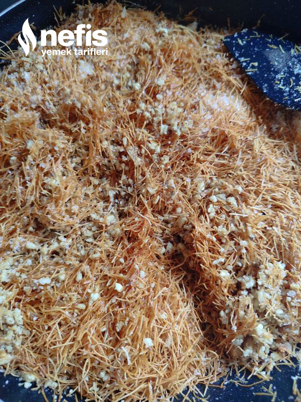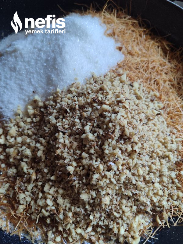 - Kadayıfı için; tereyağını tavada eritelim ve şekeri hafif eritip, sonra kadayıf ve cevizi de ekleyip karıştırıp ocaktan alıyoruz.
