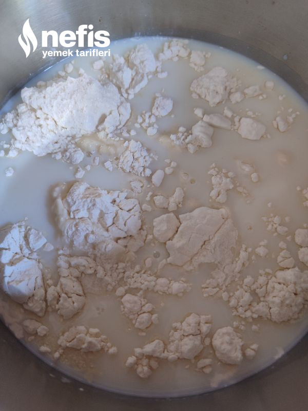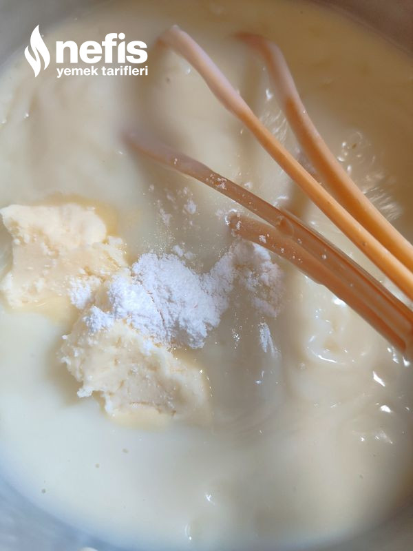 - Muhallebi için; süt, şeker, un ve nişastayı tencereye alıp karıştıralım ve ocağa alıp kaynayana kadar karıştırarak pişiriyoruz. Ocağın altını kapatıp vanilin ve tereyağını ekleyip, eriyene kadar karıştırıyoruz.