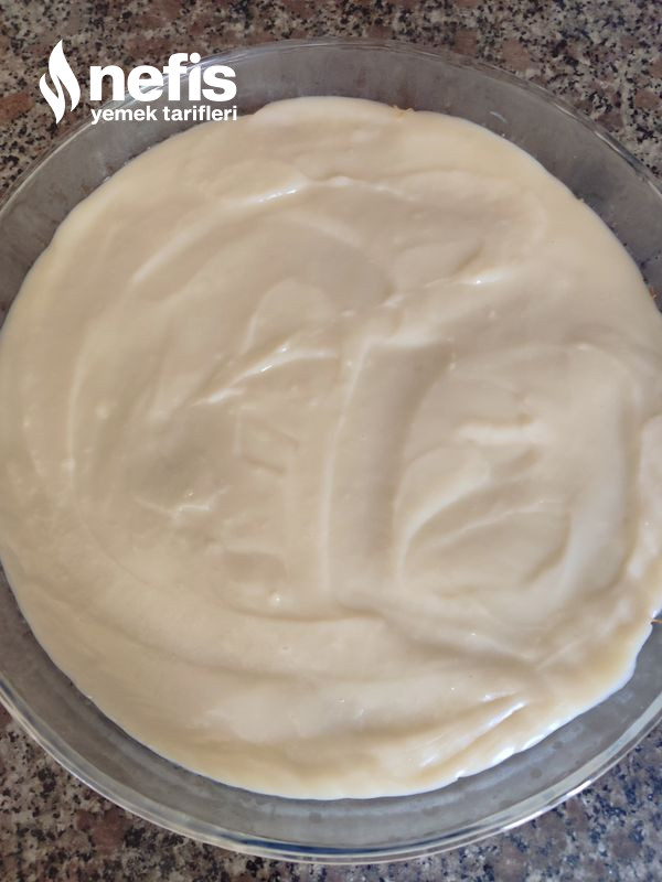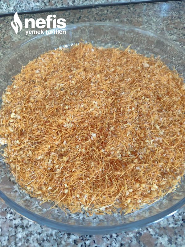 - Muhallebi yapacağımız tavayı yahut borcamı alıp, kadayıfın yarısını tabanına koyup eşit halde yayıyoruz ve muhallebiyi de koyup eşit formda yayıyoruz. En son kalan kadayıfı da üzerine alıp, eşit biçimde yayalım.