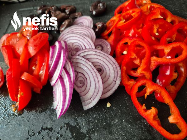 - Ben domatesi, kapya biberi ve kırmızı soğanları ince ince doğradım.