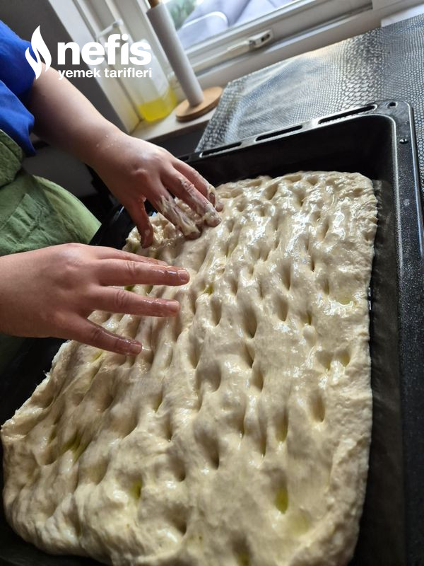 - Üzerine gerçek zeytinyağı gezdirin ve iki elinizle hamura parmaklarınızı bastırın.