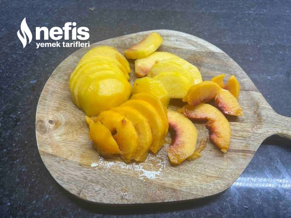5. Yıkadığınız şeftalilerin kabuğunu soyup çekirdeğini de çıkardıktan sonra yarım ay biçiminde doğrayın.
