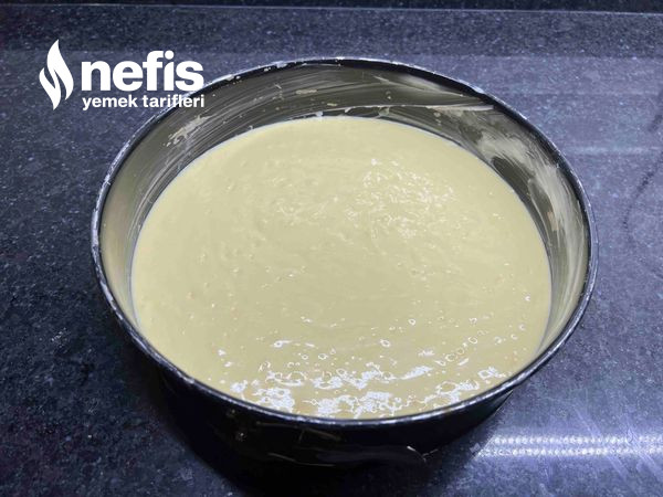 4. Kek harcını 24-26 cm yağlı kağıt serili pasta kalıbına dökün ve üzerini düzleştirin.