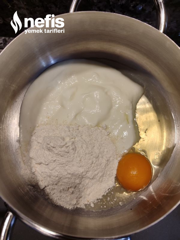 - Tencereye un, yoğurt ve yumurtayı koyarak pürüzsüz bir kıvam alana kadar çırpalım.
