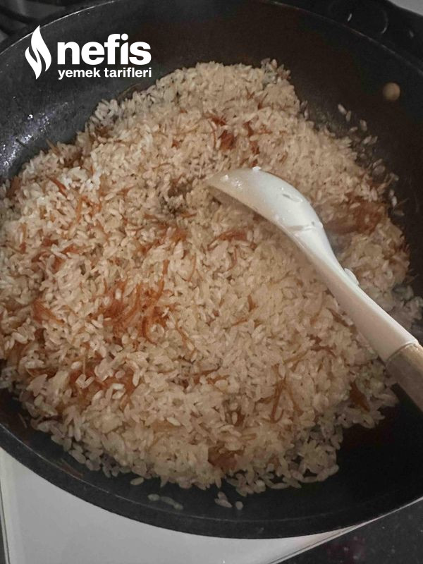 - Şehriyelerimiz kızarmaya bırakıp öbür yandan pirinçimizi yıkıyoruz suyunu süzünce kızaran şehriyelerimizin üstüne pirinçi döküp orta kısık ateşte kavuruyoruz.