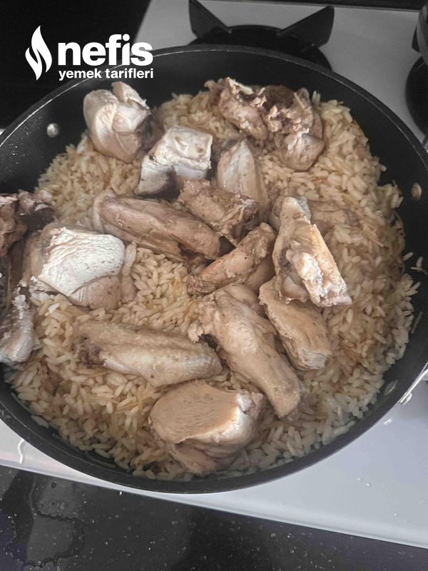 - Pilavın pişmesine yakın suyunu tam çekmemiş olsun ayırdığımız tavuk kesimlerini pilavın üstüne koyup demlemeye bırakıyoruz.