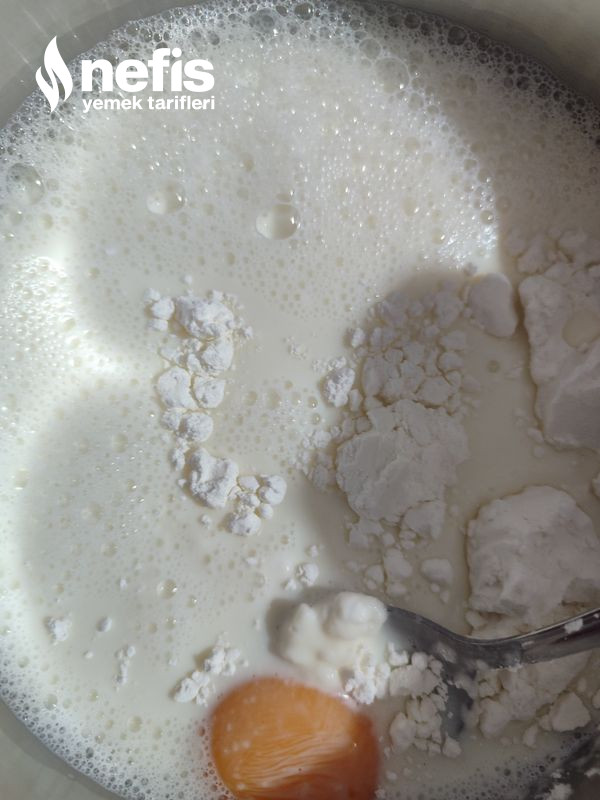- İlk olarak süt, nişasta, un, yumurta sarısı, şeker tencerede kaynayıncaya kadar karıştırılır.