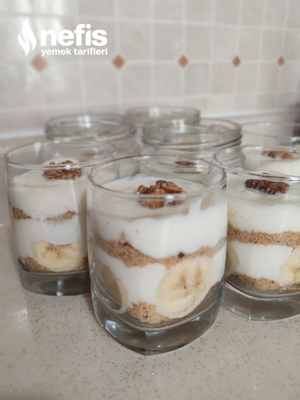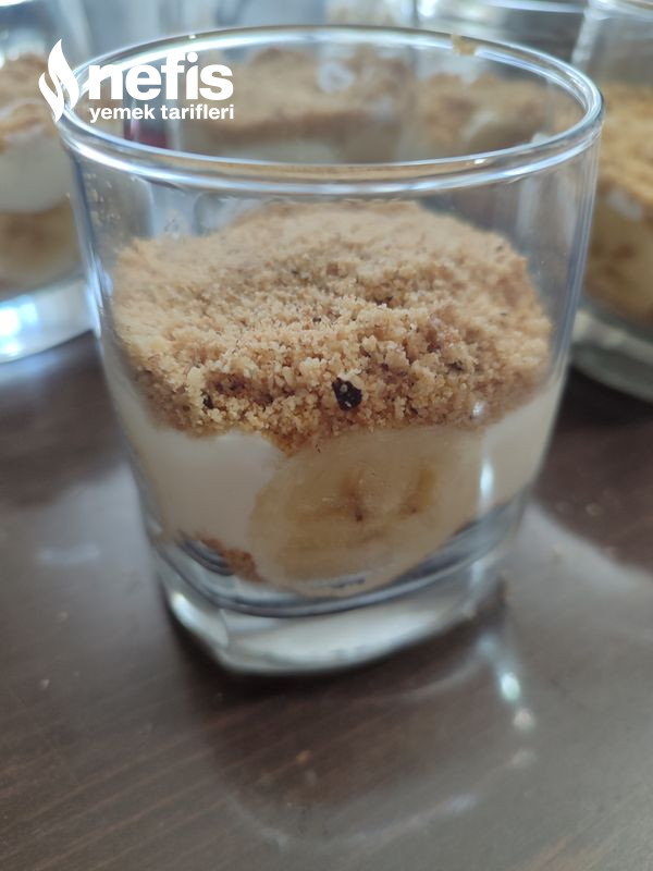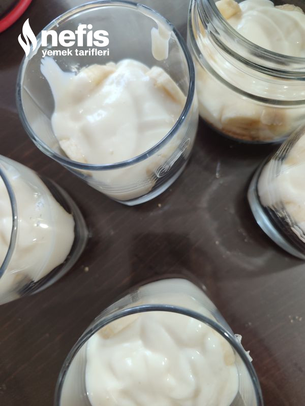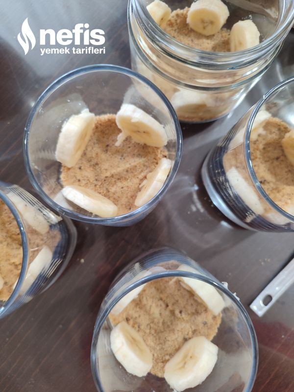 - Sunum kabının kenarlarına dilimlenen muzlar dizilir. En alta 1 yemek kaşığı bisküvi akabinde 1 kepçe krema, tekrar 1 yemek kaşığı bisküvi ve en üste 1 kepçe krema eklenir.