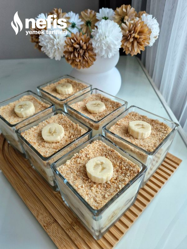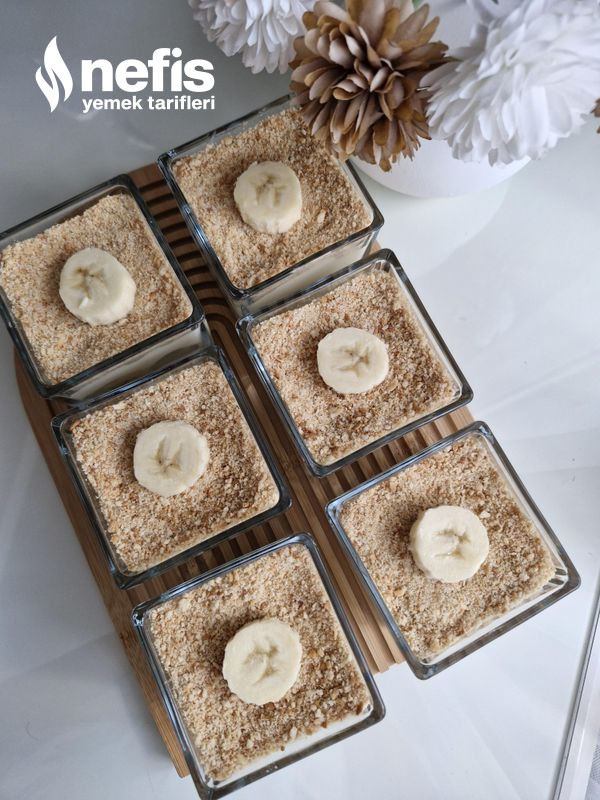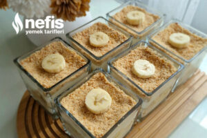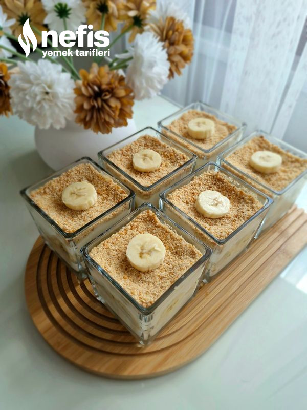 - Kaselere evvel muhallebi dökülür kenarlarına muzlar dizilir ve ortasına bisküvi eklenir tekrar muhallebi ve bisküvi konulur soğumaya bırakılır.