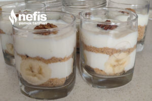 - Sunum kabının kenarlarına dilimlenen muzlar dizilir. En alta 1 yemek kaşığı bisküvi akabinde 1 kepçe krema, tekrar 1 yemek kaşığı bisküvi ve en üste 1 kepçe krema eklenir.