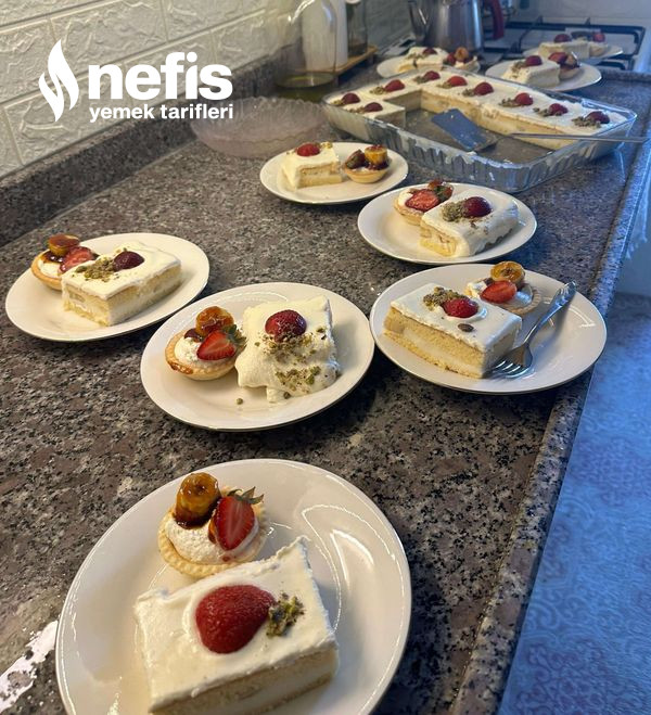 9. Pastayı dilimledikten sonra istediğiniz süsle süsleyebilirsiniz ben çilek ve antep fıstığı kullandım. Tanımı denemeniz de muvaffakiyetler dilerim afiyet olsun.