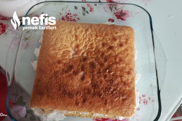 5. Üzerine ikinci katı kapatıp sütle ıslatalım krem şanti koyup her yerine yayalım.