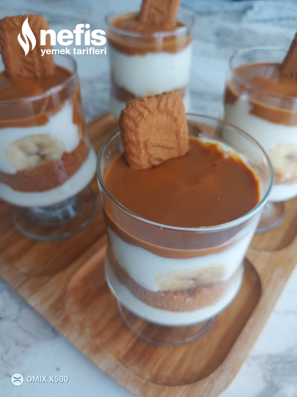 - Lotus bisküvisi rondoda çekilir. Kuplara yahut rastgele bir kaseye birinci olarak bir kepçe sos üzerine bisküvi kenarlarına muz konur. Üzerine bir kepçe daha sos dökülür tüm kaseler bu türlü tamamlanır.
