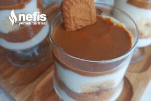 - Lotus bisküvisi rondoda çekilir. Kuplara yahut rastgele bir kaseye birinci olarak bir kepçe sos üzerine bisküvi kenarlarına muz konur. Üzerine bir kepçe daha sos dökülür tüm kaseler bu türlü tamamlanır.