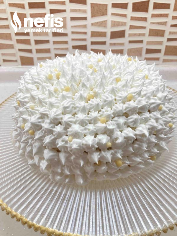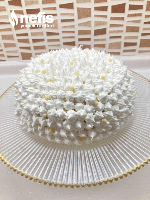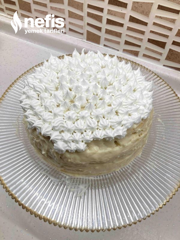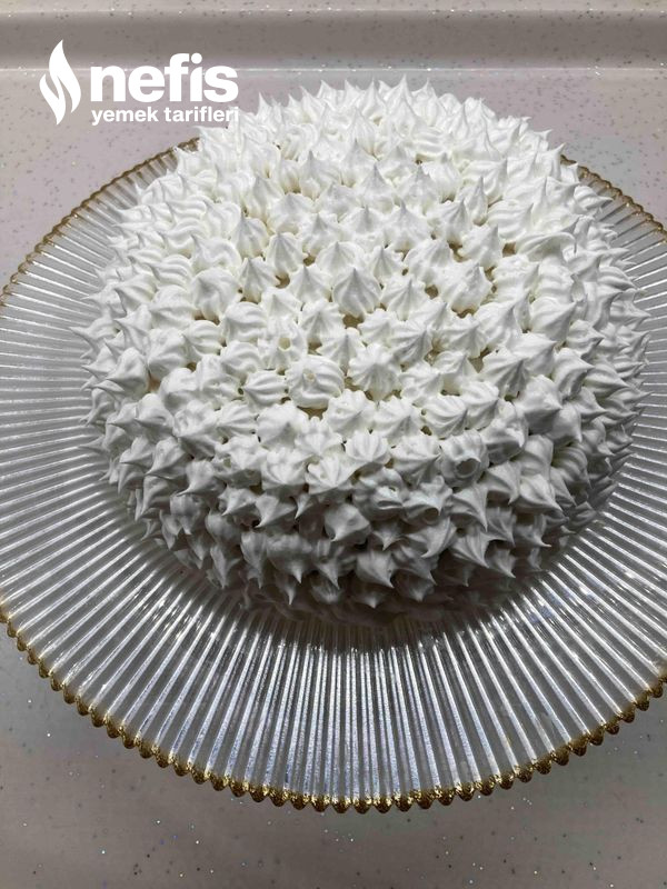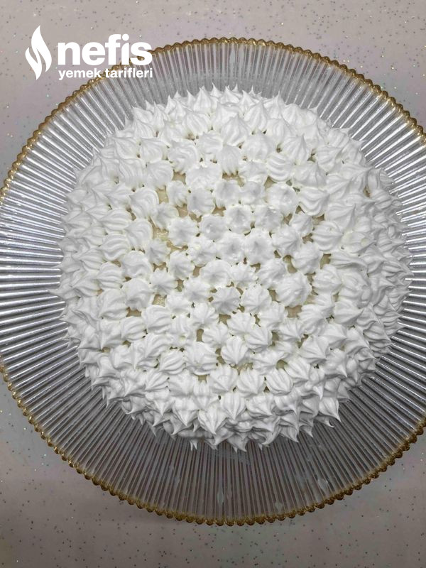 13. Dinlenen pastanın üzerini kalan krema ile kaplayalım. En son pastanın her yerini hazırladığımız kremşantiyle aparat yardımı ile süsleyerek kapatalım.